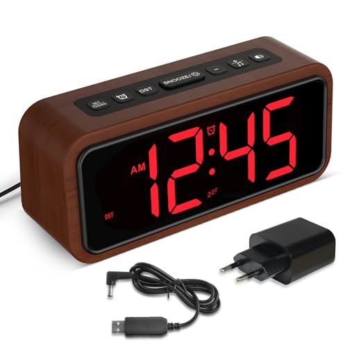 Väckarklocka ljud för djupsömnare, väckarklocka trä med LED-display, 12 larmringsignaler, 5 justerbara ljusstyrkor, 5 volymer, manuell DST, brun väckarklocka retro för sovrum (röd)