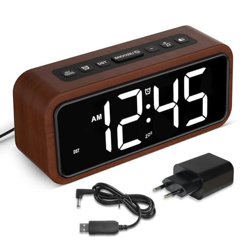 Väckarklocka ljud för djupsömnare, väckarklocka trä med LED-display, 12 larmringsignaler, 5 justerbara ljusstyrkor, 5 volymer, manuell DST, brun väckarklocka retro för sovrum