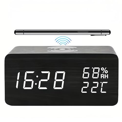 Digital väckarklocka trä med trådlös QI-laddning, LED-digital klocka med 3 larminställningar och visningsfunktion för temperatur och luftfuktighet, lämplig för vardagsrum, sovrum och kontor (svart)