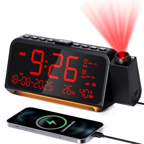 Digital väckarklocka, projektionsväckarklocka, FM-radio och automatisk avstängningstimer, 320° projektor med dimmer, helgutläge, dubbelt larm, temperatur och luftfuktighet, väckarklocka ljud med