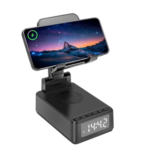 Carehabi 5 i 1 Bluetooth-högtalare med mobiltelefonhållare, trådlös laddare mobiltelefonhållare med väckarklocka digital, presenter till män pappa mamma kvinnor, födelsedagspresent
