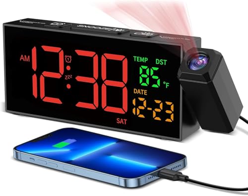Netzu Projektion väckarklockor sängbord, hög väckarklocka med 350° roterbar projektor, temperatur, datum, 10 larmtoner, 4 volymer, USB-laddare, projektorväckarklocka för sovrum vardagsrum (RGB)