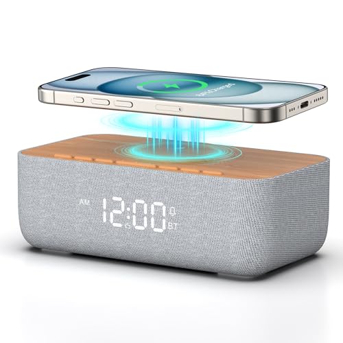 COLSUR digital klockradio med trådlös laddare, Bluetooth-högtalare med USB-laddare, smart väckarklocka med snooze-funktion, induktiv laddningsstation, nattlampa, dimbar LED-display och batteribackup