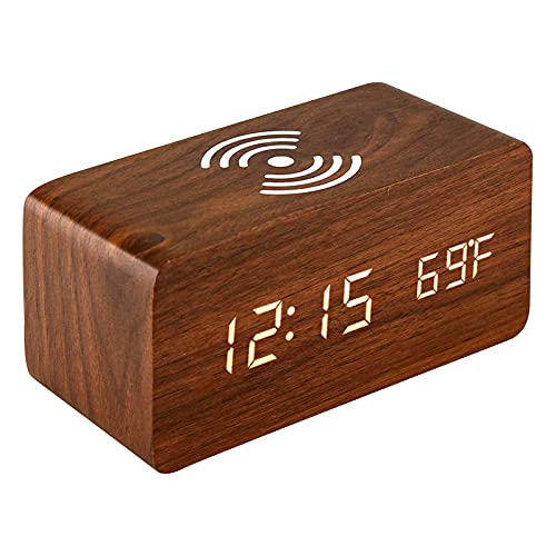 FISURA – Väckarklocka med trådlös laddare LED trä väckarklocka. Väckarklocka med inget tickande temperaturvisning. Mått: 10,5 x 8 centimeter. (Trä)