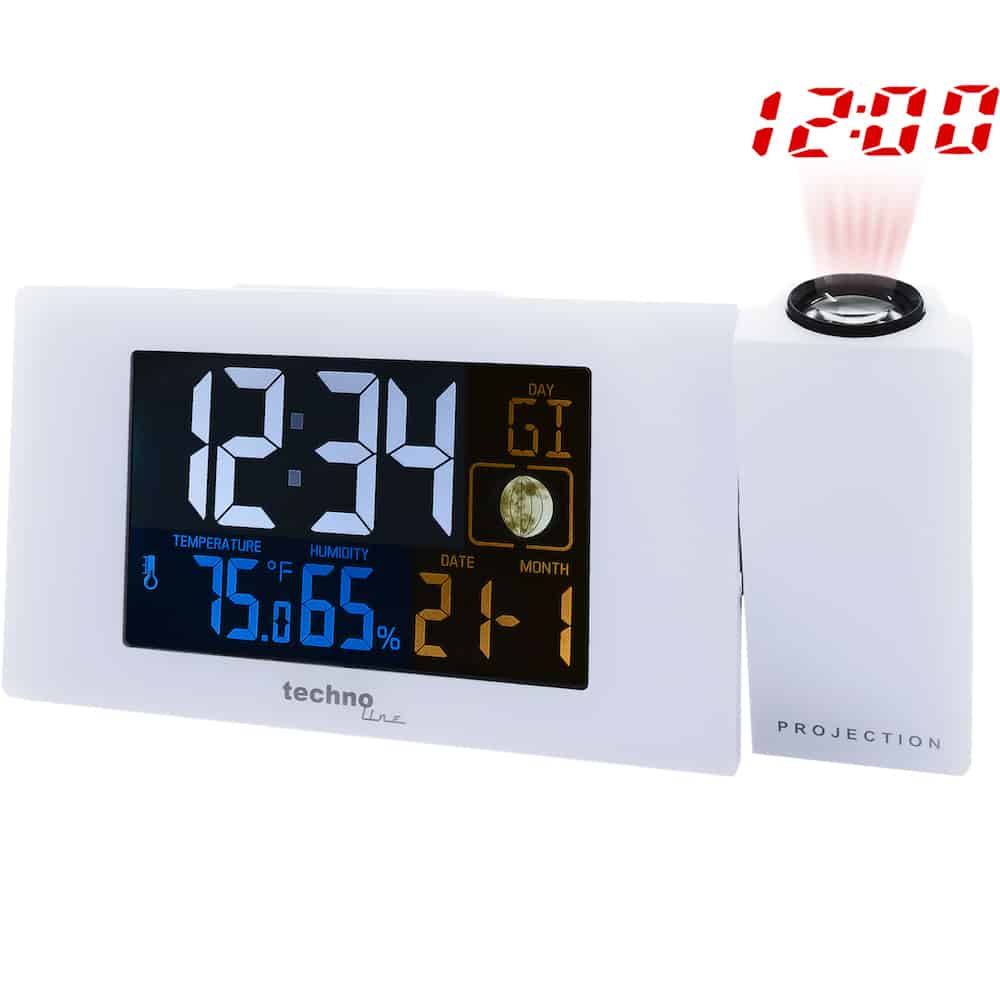 Digital väckarklocka, projektionsväckarklocka, FM-radio och automatisk avstängningstimer, 320° projektor med dimmer, helgutläge, dubbelt larm, temperatur och luftfuktighet, väckarklocka ljud med