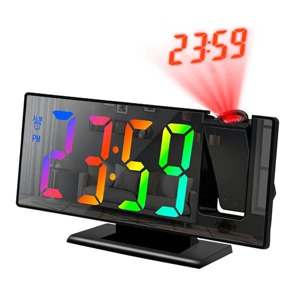 Väckarklocka med LED-projektor och multifunktionell spegeldesign