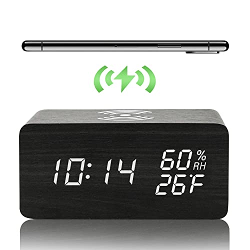 Digital väckarklocka trä med trådlös QI-laddning, LED-digital klocka med 3 larminställningar och visningsfunktion för temperatur och luftfuktighet, lämplig för vardagsrum, sovrum och kontor (svart)