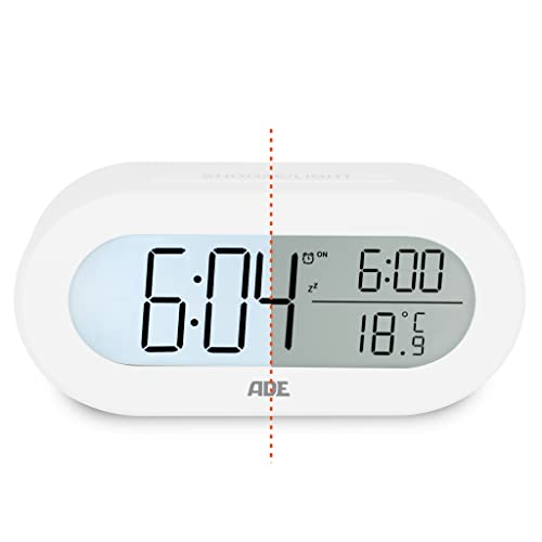 ADE, Digital väckarklocka med temperaturdisplay: klocka och termometer med stora siffror, vit digital väckarklocka, icke-tickande, trådlös, batteridriven, 12/24 timmar, vit, 141 x 30 x 69 mm