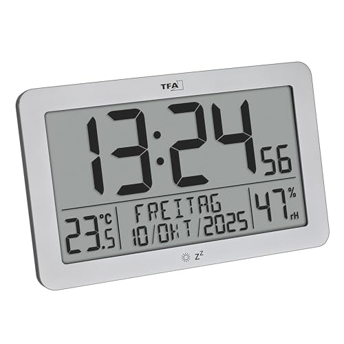 TFA Dostmann Digital trådlös väggklocka med inomhusklimat, 60.2568.54, datum och veckodag, väckarklocka med snooze, radioklocka, bordsklocka med luftfuktighet och temperatur inuti, lättläst, silver