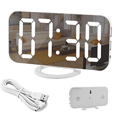 Spegelväckarklocka, digital väckarklocka, stor 6,5 tums LED-display med ljusavkännande dämpningsläge, justerbar ljusstyrka, 2 USB-laddningsportar, stor snooze-knapp, för sovrum, vardagsrum, heminredning, vit