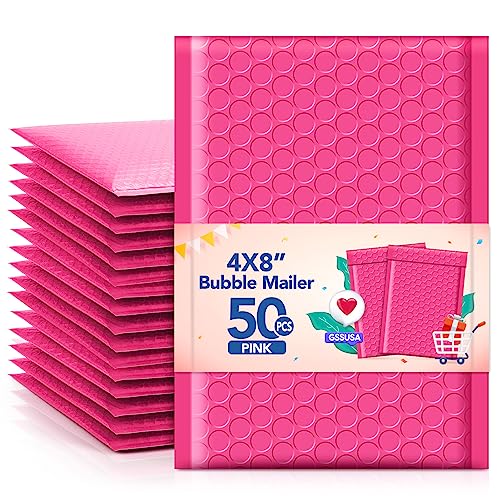 GSSSUSA Bubbelkuvert, 10 x 20 cm, 50-pack, vadderade kuvert, användbar storlek 10 x 18 cm, fraktkuvert, självförseglande små förpackningar, fraktpåsar för att posta smycken, för småföretag, rosa