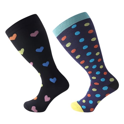 BoloShine 2 par kompressionsstrumpor för män, kvinnor, extra breda diabetiska vadstrumpor, kompressionsstrumpa i stor storlek, Svart kärlek + färgglada prickar, XXL