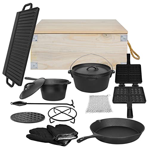 XMTECH Dutch Oven set inkl. Dutch Oven såkruka, grillplatta, kastrull, våffeljärn, locklyftare och massor av tillbehör, 11 delar i trälåda, eldkruka, grillgryta, gjutjärn