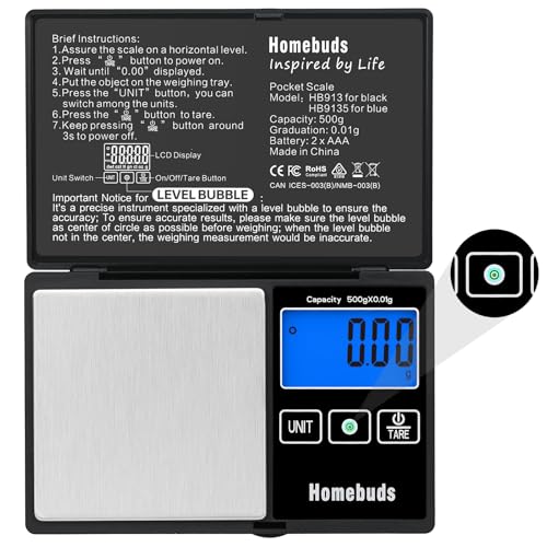 Homebuds 500 g digital våg hög precision i 0,01 g med nivåbubbla, garanterad av Precision Scale Professional Factory sedan 2001, viktvåg för labb, kök, kaffe, smycken; 2*AAA, Svart
