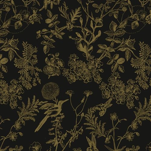 Yomshi Självhäftande tapet svart guld blommor och fåglar möbelfolie 44 × 300 cm vintage tapet självhäftande vinyl självhäftande film blommor och blad tapet för vägg möbler