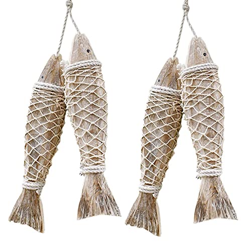 WANGCL 4-delad träfisk dekoration prydnad hängande trä fisk dekoration handsnidad trä fisk väggkonst för hem inomhus utomhus uteplats veranda kontor nautisk vägg strand tema dekoration (S)