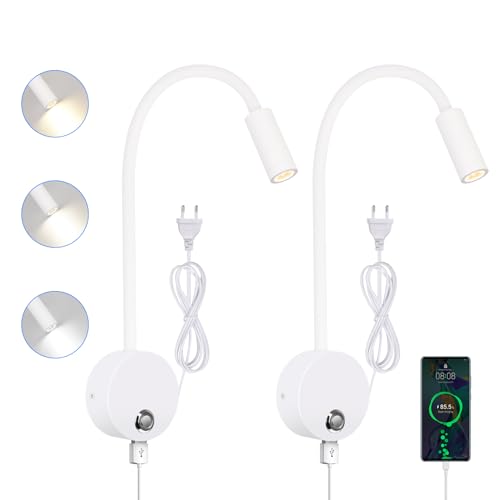 ERWEY LED-vägglampa vit läslampa vägg, sänglampa med tryckknapp justerbart ljus 3000-6000K, 4W sänglampa 360° flexibel svanhalslampa med USB-laddningsport för säng, sovrum