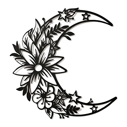 Vivegate Moon metall blommig konst dekor – 35 x 13 cm svart boho stor blommig mån- och stjärnfas väggskyltar för halvmåne blomma skulptur hängande väggdekor för sovrum