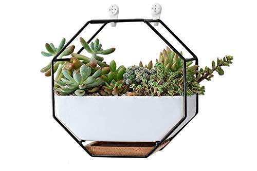 VanEnjoy 17,78 cm vita keramiska väggplanterare vas och koppar, dräneringshål med bambubricka – suckulent kruka luftväxter mini kaktus konstgjorda blommor hängande geometrisk hexagon väggdekor