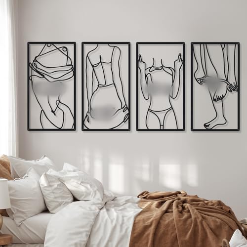 Cren 4 delar mental minimalistisk abstrakt kvinna väggkonst enkel linje ritning väggkonst dekor modern kvinna kropp hem hängande metall väggdekor för kök badrum vardagsrum (svart)