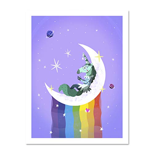 Wee Blue Coo Enhörning måne regnbåge stjärnor konst stor inramad konst tryck affisch väggdekor 45 x 60 cm