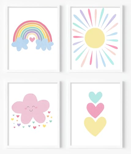 Rosa väggkonst för barnkammare baby flicka kanvas regnbåge pastell väggdekor boho rosa moln färgglada solsken hjärtan väggkonst för småbarn flickor baby barnrum dekor, set med 4 (20 x 25 cm, utan