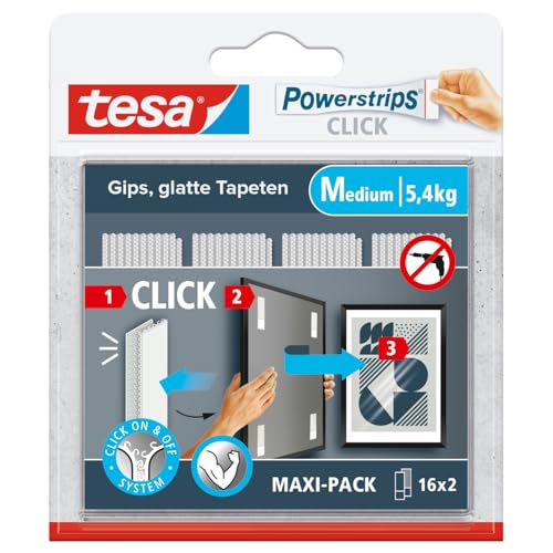 tesa Powerstrips CLICK – självhäftande remsor för fastklämning och borttagning av bildramar, väggdekor, ingen borrning – självhäftande remsor med ON & OFF klicksystem, medium – 16 x 2 st