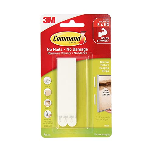 Command 17207 smala tavelhängremsor, 4 stycken x 2 självhäftande remsor, vita – skadefritt hängande – för bilder, ramar och väggdekor – rymmer upp till 5,4 kg