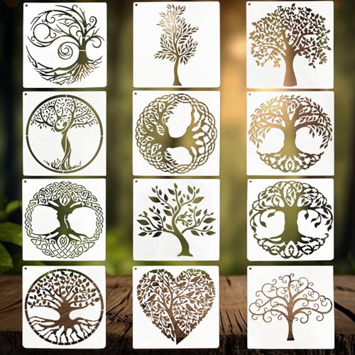 Trädstenciler, 12 st Stenciler för hantverk Återanvändbara Livets träd Schabloner för målning med rund ring Naturliga växter Stencil för målning Gör-det-själv-konsthantverk Scrapbook Väggdekor