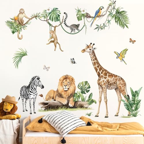 decalmile Stor djungel djur tropiska löv väggdekaler safari träd lejon giraff apa väggklistermärken baby barnkammare barn sovrum vardagsrum väggdekor