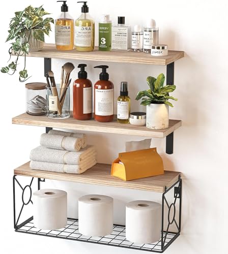 Pipishell Flytande hyllor med trådkorg, Paulownia trä badrumshyllor för hemorganisation och väggdekor, badrum/kök/vardagsrum/kontorshyllor, set med 3 + 1, naturlig