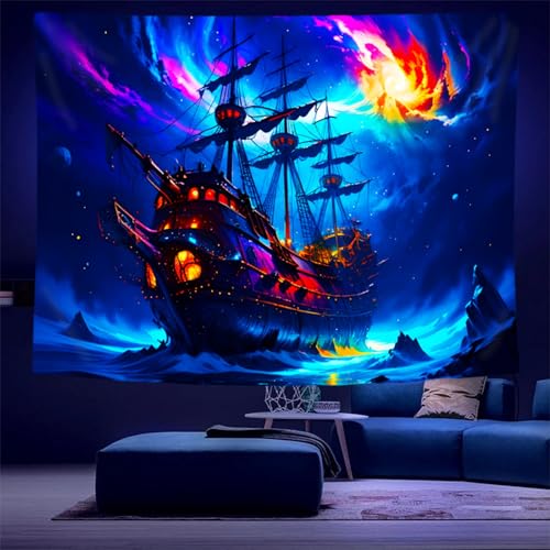 Arsey Blå spöke piratskepp svart ljus gobeläng UV reaktiv hav landskap gobeläng hippie segelbåt väggbonad väggdekoration sovrum vardagsrum festdekoration, stor storlek 230 x 180 cm