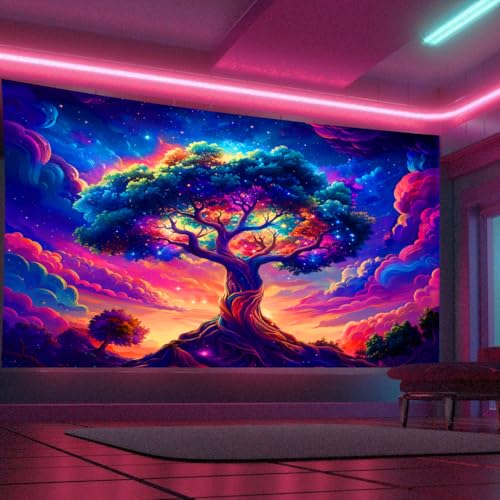 Arsey svart ljus gobeläng estetisk livsträd väggbonad psykedelisk UV – reaktiv väggbonad galaxhimmel färgglad natur landskap träd livets väggdekoration vardagsrum, 300 x 180 cm