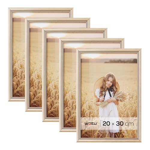 WOLTU Set med 5 fotoram 20 x 30 cm, ram i massivt trä med passepartout, kan hängas horisontellt eller vertikalt, väggdekoration eller på bord, guld