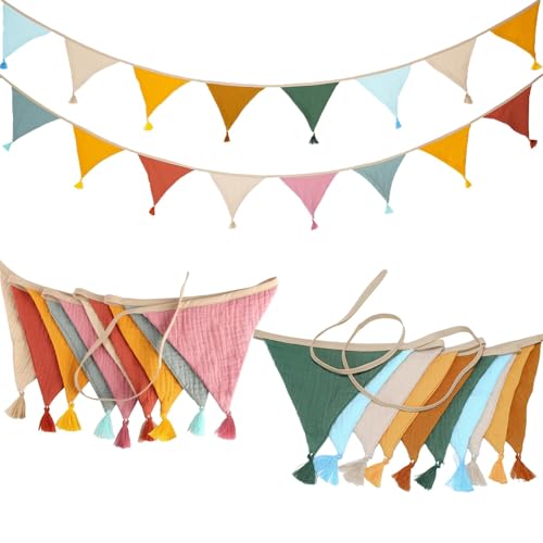 DMSESRLS 2 stycken vimpelgirlang, barnrum, muslin, bomull, tyg, flaggirlang med tofsar, 2,6 m väderbeständig flaggirlang, utomhus, för girlang, barnrum, dekoration, hussäng, babysäng, väggdekoration