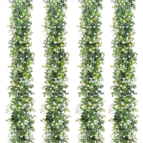 SOMYTING 4 Stycken Konstgjord Eukalyptus Girlang - Grön Handgjord Med Vita Blommor för Bröllop Bakgrund Båge Väggdekoration - UV-Skyddad Vinrankor Blad för Inomhus och Utomhus