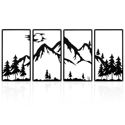 YunBey Väggdekoration berg metall 4 stycken väggskulpturer metalldekoration stora berg och skog väggkonst metall för vardagsrum sovrum kontor trädgård utomhus (svart, 43 x 111 cm)