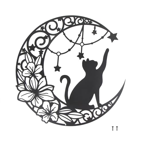 30 cm metall väggkonst väggdekoration silhuett konst (katt plockar stjärnor på månen), svart väggdekoration hängande, modern väggkonst utsnitt väggdekorationer för inomhus, utomhus, trädgård