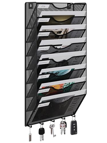 EasyPAG Metall 8 nivåer A4 väggmonterad dokumenthållare, hängande väggfilorganisatör, duvhålsförvaring, arkivbricka, väggficka, tidningsställ med 5 krokar för kontor och hem, svart