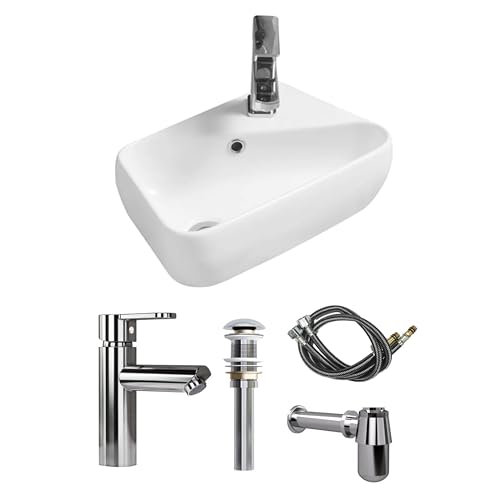 MEJE 45 x 28 x 15,5 cm vägghängt badrumshörn handfat, litet badrumshandfat, keramisk vit rektangel tvättställ (höger hand)