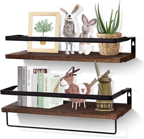 Uten vägghylla, rustik svävande hylla, trä metall med handdukshållare, set om 2, för väggmontering för sovrum, vardagsrum, badrum, kök, kontor, brun, 42 x 15 x 7,5 cm