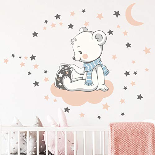 Väggklistermärken för barn - dekoration av babyrum - väggklistermärken för barn - björn väggdekaler på molnet + 110 stjärnor - Väggklistermärke för pojke - H40x L30 cm