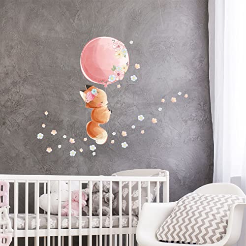 Väggklistermärken för barn - dekoration av barnkammaren - väggklistermärken räv och ballong + 60 blommor - H30 x L35 cm