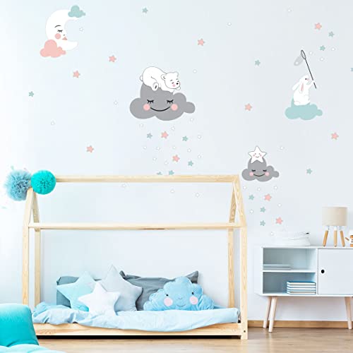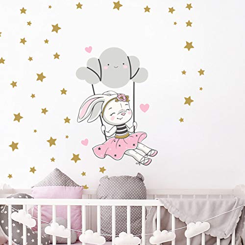 Väggklistermärken för barn - dekoration av babyrum - väggklistermärken för barn - kanin väggklistermärke på molnet + 100 stjärnor - väggklistermärken för flickor - H45x L30 cm