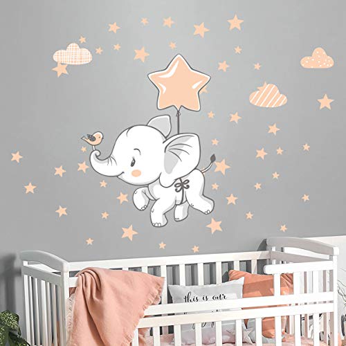 Väggklistermärken för barn - dekoration av barnkammaren - väggklistermärken för barn - glad elefant + 120 stjärnor - väggdekal för pojkar - H40x L30 cm