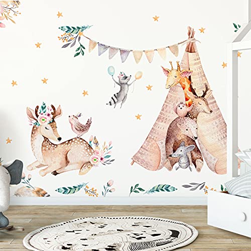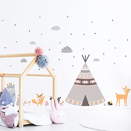 Väggklistermärken för barn – väggdekoration för barnrum – väggklistermärke för barn – skandinaviska djur och indiska tipier, H60 x L90 cm