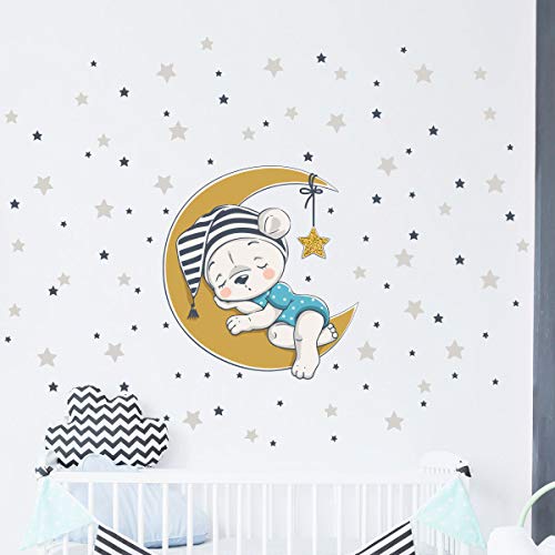 Väggklistermärken för barn - dekoration för babyrum - väggklistermärken för barn - björn på månen + 100 stjärnor - väggklistermärke för pojkar - H30x L30 cm
