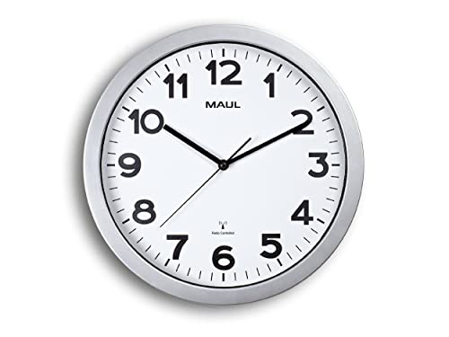 Maul Väggklocka Maulstep Ø 35 cm, Radioklocka Med Automatisk Tidsinställning, Perfekt För Vardagsrum, Sovrum, Kök, Arbetsrum Och Kontor, Bra Läsbarhet För Stora Rum, Silver