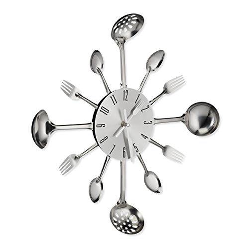 Relaxdays Väggklocka bestick, köksklocka sked, gaffel och murslev, Ø 40 cm, batteridriven, med tickande, bestickklocka, silver