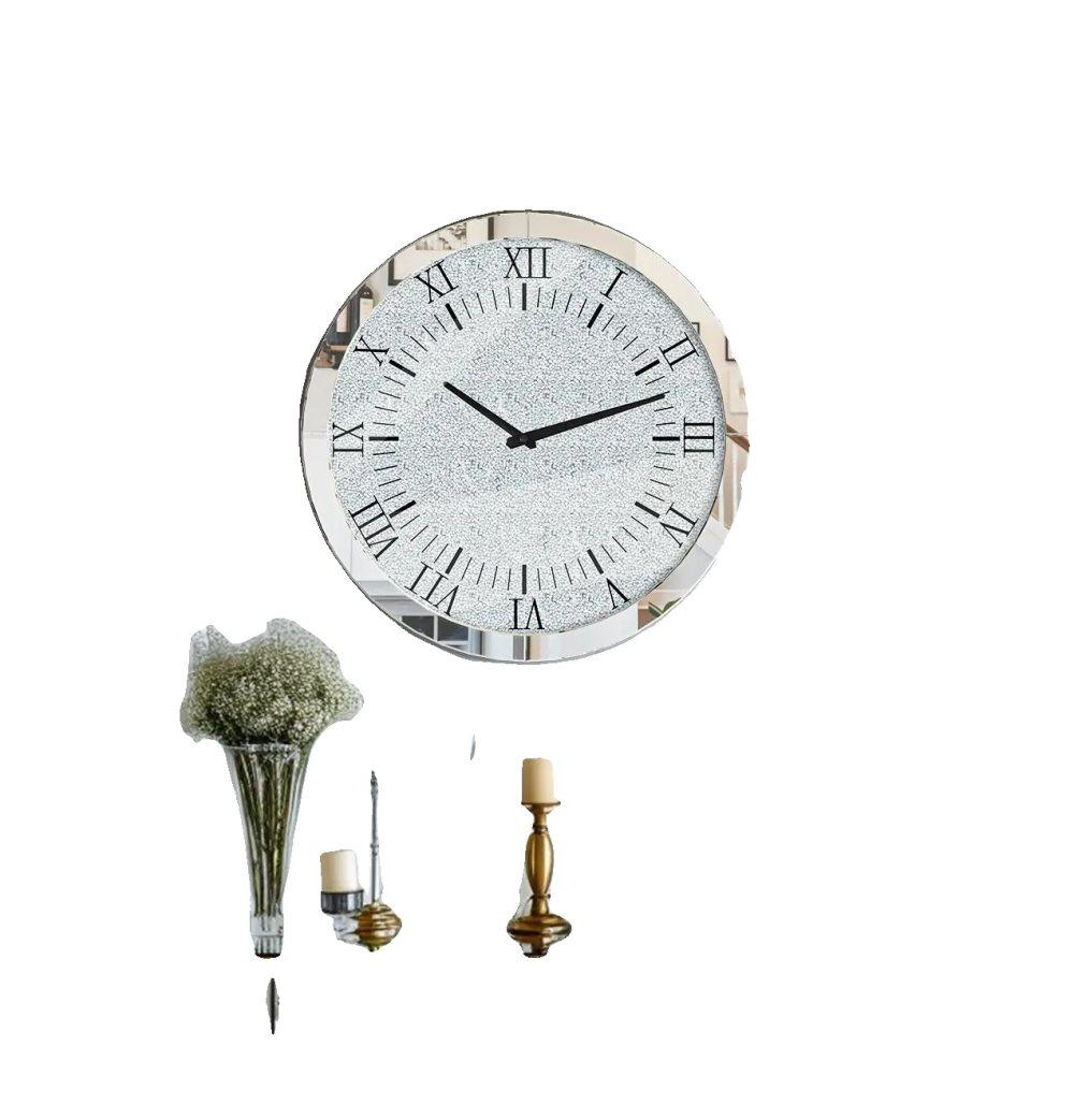Ejoyous Väggklocka, Rund Diamant Design, Silver, 3D Kristall Tyst, Metallkonst för Vardagsrum Sovrum